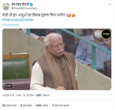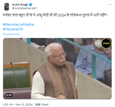 वायरल वीडियो में वे यह कहते सुनाई दे रहे हैं कि ”बहुत भारी मन से … कल रात मुझे नींद नहीं आयी। कल महिला दिवस था…” वीडियो के साथ कैप्शन में लिखा गया है कि ‘मनोहर लाल खट्टर के आंसू भारी पड़ेंगे मोदी जी! पहले शिवराज सिंह चौहान को रुलाया और अब खट्टर काका और साथ में अनिल बिज को भी!’