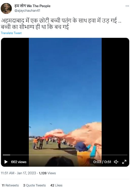 अहमदाबाद में एक छोटी बच्ची पतंग के साथ उड़ गई।