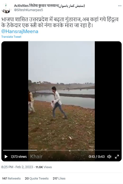 सोशल मीडिया पर एक वीडियो शेयर कर दावा किया जा रहा है कि उत्तर प्रदेश में एक महिला के साथ ‘हिंदुत्ववादी’ समूह के लोगों ने मारपीट की है। कहा जा रहा है कि उसके साथ मारपीट इसलिए की गई क्योंकि वह महिला दलित समुदाय से आती है और नदी किनारे स्नान करने जा रही थी।