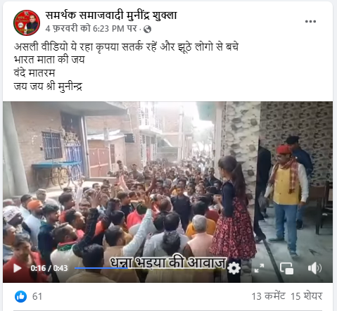 पड़ताल के दौरान कुछ कीवर्ड की मदद से फेसबुक पर खोजना शुरू किया। इस दौरान हमें समर्थक समाजवादी मुनींद्र शुक्ला नामक फेसबुक पेज द्वारा 04 फरवरी 2022 को अपलोड किया एक वीडियो प्राप्त हुआ। वीडियो में साफ सुना जा सकता है कि पाकिस्तान बनाना है के नारे नहीं बल्कि माटी चोर भगाना है के नारे लग रहे हैं।