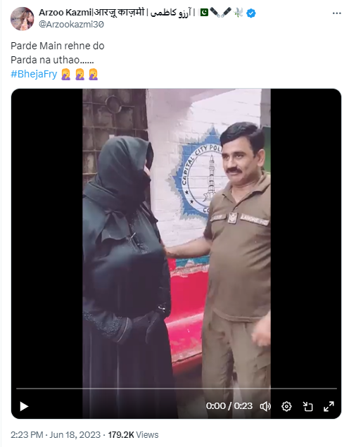 वायरल वीडियो करीब 23 सेकेंड का है. इस वीडियो में एक वर्दीधारी एक व्यक्ति के चेहरे से बुर्का हटाते हुए दिख रहा है. इसके अलावा, वीडियो में एक टेक्स्ट भी मौजूद है, जिसमें लिखा हुआ है, “बुर्के में रहने दो बुर्का ना हटाओ बुर्का जो हट गया तो भेद खुल जाएगा”. (वीडियो में अश्लील दृश्य भी मौजूद हैं.)