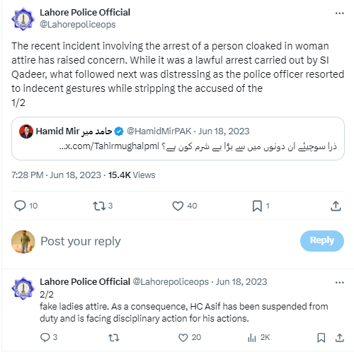 लाहौर पुलिस ने अंग्रेज़ी में ट्वीट करते हुए लिखा था, जिसका हिंदी अनुवाद है “महिला की पोशाक पहने एक व्यक्ति की गिरफ्तारी से जुड़ी इस घटना ने चिंता बढ़ा दी है. हालांकि यह एसआई कादिर द्वारा की गई एक वैध गिरफ्तारी थी, लेकिन इसके बाद जो हुआ वह परेशान करने वाला था, क्योंकि पुलिस अधिकारी ने उक्त शख्स के शरीर से महिला की पोशाक उतारते समय अभद्र इशारे किए. इसके लिए हेड कांस्टेबल आसिफ को ड्यूटी से निलंबित कर दिया गया है और उन्हें अनुशासनात्मक कार्रवाई का सामना करना पड़ रहा है”.
