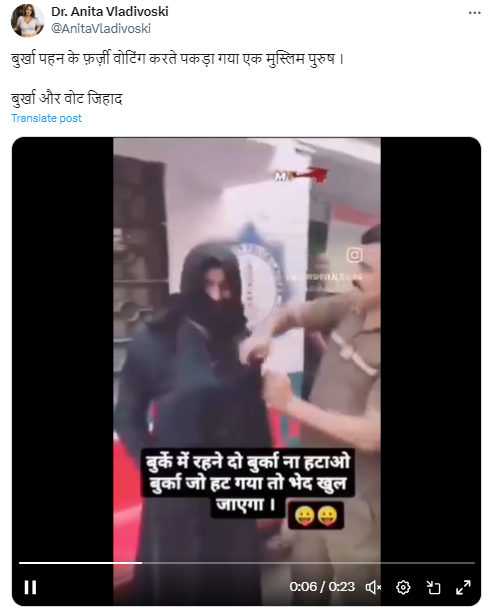 सोशल मीडिया पर एक वीडियो वायरल हो रहा है, जिसमें खाकी वर्दी में दिख रहा एक व्यक्ति एक शख्स के चेहरे से बुर्का हटाते हुए दिख रहा है. इस वीडियो को “वोट जिहाद” और लोकसभा चुनाव में फर्जी वोटिंग के दावे के साथ शेयर किया गया है.
