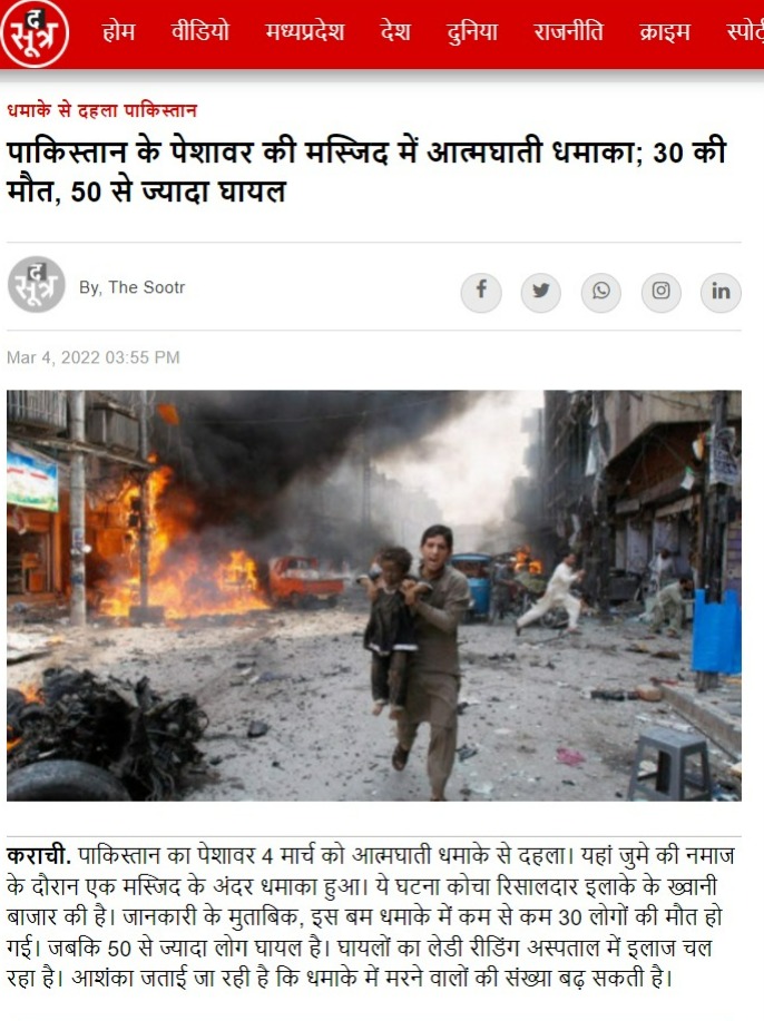 सोशल मीडिया पर एक तस्वीर को शेयर करते हुए इसे पाकिस्तान के पेशावर स्थित मस्जिद में हुए बम धमाके का बताया जा रहा है। The Sootra.com नामक वेबसाइट ने वायरल तस्वीर को शेयर करते हुए लिखा, “पाकिस्तान के पेशावर की मस्जिद में आत्मघाती धमाका; 30 की मौत, 50 से ज्यादा घायल।”