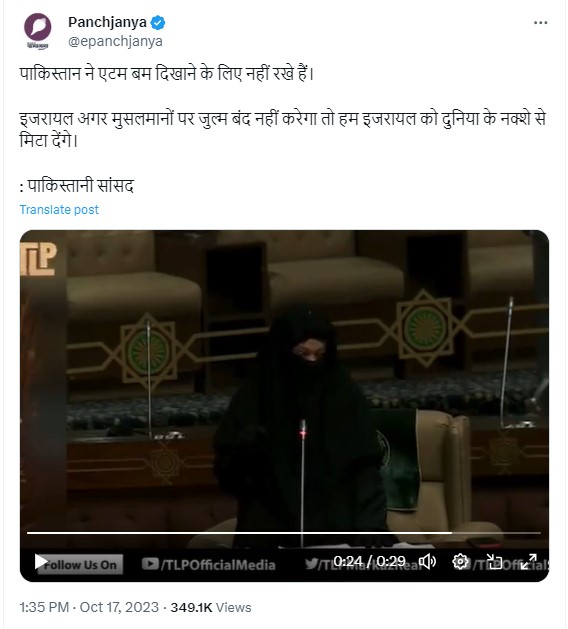 वीडियो को पांचजन्य के आधिकारिक X अकाउंट से शेयर करते हुए कैप्शन में लिखा गया है, “पाकिस्तान ने एटम बम दिखाने के लिए नहीं रखे हैं। इजरायल अगर मुसलमानों पर जुल्म बंद नहीं करेगा तो हम इजरायल को दुनिया के नक्शे से मिटा देंगे: पाकिस्तानी सांसद”.