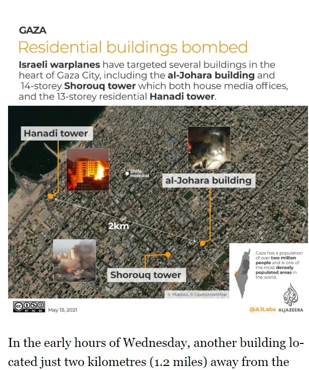 इसके अलावा, हमें अल जज़ीरा की वेबसाइट पर 13 मई 2021 को प्रकाशित रिपोर्ट भी मिली. इस रिपोर्ट में मौजूद जानकारी के अनुसार, यह बिल्डिंग साल 1995 में बनाई गई थी और इसमें कई टीवी चैनल्स और मीडिया हाउस के दफ़्तर थे. 12 मई 2021 को हमले से कुछ देर पहले ही इसराइल की तरफ से बिल्डिंग के गार्ड को सूचना दी गई थी. इसके बाद F-16 फाइटर जेट के जरिए इसराइल ने इस बिल्डिंग पर हमला कर दिया. रिपोर्ट में यह भी बताया गया था कि उस दौरान इसराइल ने अल-शोरौक के अलावा अल-जोहारा और हनादी टॉवर नाम की दो बहुमंजिला इमारतों को भी निशाना बनाया था.