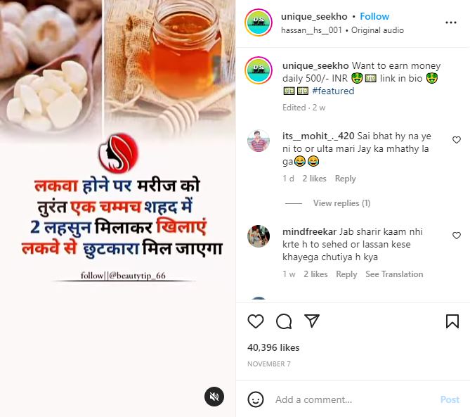 सोशल मीडिया पर लकवा बीमारी से संबंधित एक पोस्ट वायरल है। दावा किया जा रहा कि लकवा होने पर मरीज़ को तुरंत एक चम्मच शहद में दो लहसुन मिलाकर खिलाने से इस बीमारी से छुटकारा मिल जाता है।