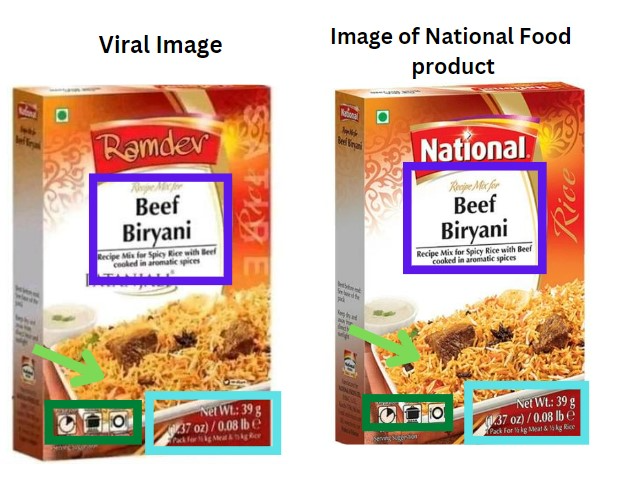 National Food की वेबसाइट पर हमें कंपनी द्वारा बेचे जाने वाले Beef Biryani के मसाले की तस्वीर प्राप्त हुई. वायरल तस्वीर तथा National Food की वेबसाइट पर मौजूद तस्वीर के बीच तुलनात्मक विश्लेषण करने पर हमने पाया कि National Food द्वारा प्रकाशित तस्वीर को एडिट कर ‘National’ की जगह ‘Ramdev’ लिखा गया है तथा निचे ‘Patanjali’ जोड़ा गया है.