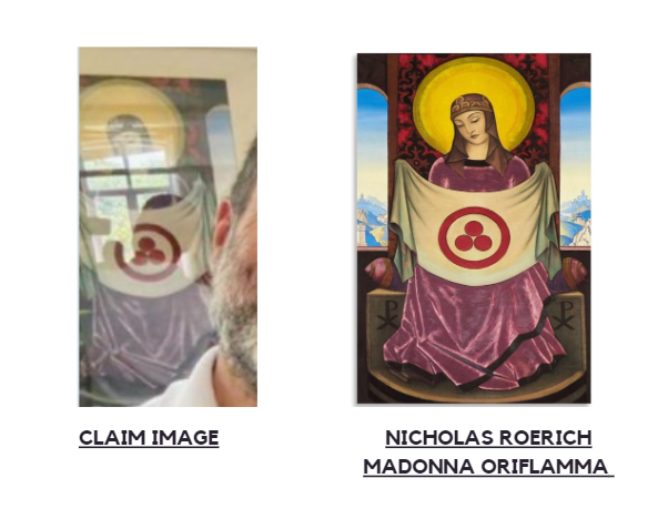 राहुल गाँधी और सोनिया गांधी के पीछे दिख रही एक तस्वीर को ईसा मसीह की तस्वीर बताया जा रहा है। इस फोटो के जरिए दोनों पर धर्म को लेकर तंज कसा जा रहा है। वायरल तस्वीर में पेंटिंग वाले हिस्से को गौर से देखने पर वहां एक लाल गोले में तीन लाल बिंदुओं वाला एक ध्वज नज़र आता है। गूगल की-वर्ड सर्च की मदद से हम इससे जुड़ी अधिक जानकारी खोजते हैं। इस दौरान हमें इस तस्वीर के साथ साल 2017 में प्रकाशित एक ब्लॉग मिलता है। यहाँ दी गयी जानकारी में बताया गया है कि इस पेंटिंग का नाम ‘मैडोना ओरिफ्लेमा’ है जिसे 1932 में निकोलाई रोएरिच’ नामक कलाकार द्वारा बनाया गया था।