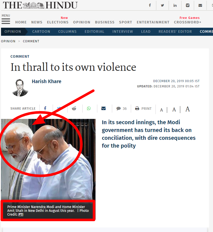 The Hindu ने अपने लेख में प्रधानमंत्री मोदी और गृह मंत्री की यही तस्वीर प्रकाशित की है लेकिन इसमे दोनों ने ही मुस्लिम टोपी नहीं पहना है। प्रकाशन ने तस्वीर को दिल्ली का बताया है।