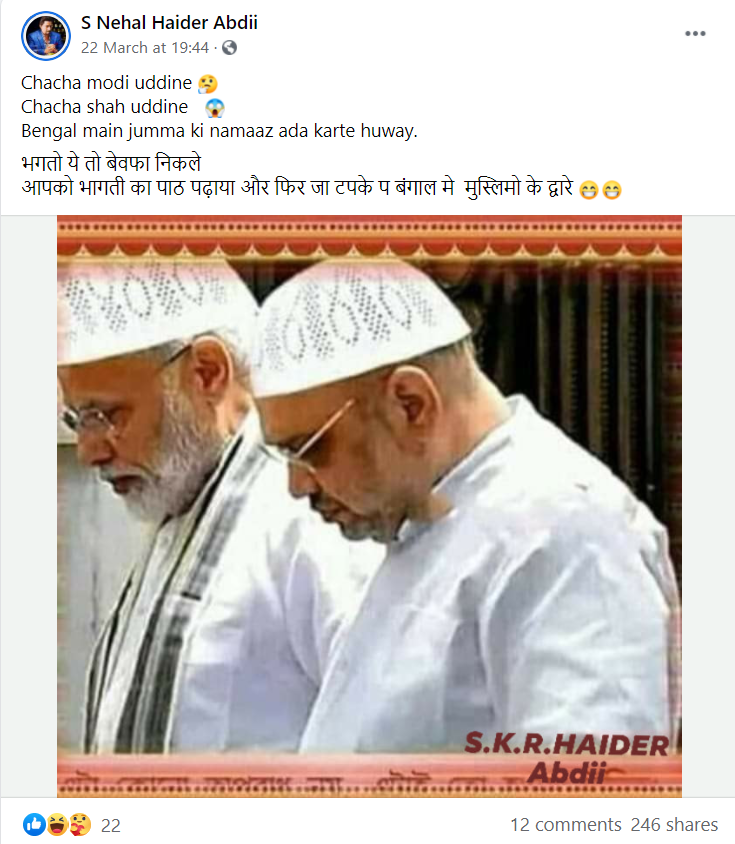 सोशल मीडिया पर एक तस्वीर शेयर कर यह दावा किया गया कि पश्चिम बंगाल में चुनाव आते ही पीएम मोदी और गृह मंत्री अमित शाह ने मुस्लिम टोपी यानि अमूमन मुस्लिम समुदाय के लोगों द्वारा पहने जाने वाली टोपी पहन ली है।