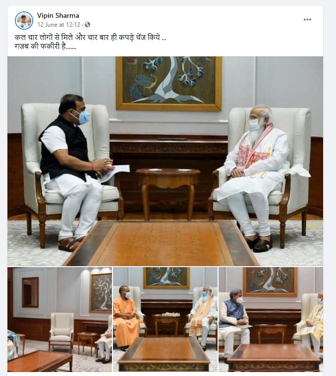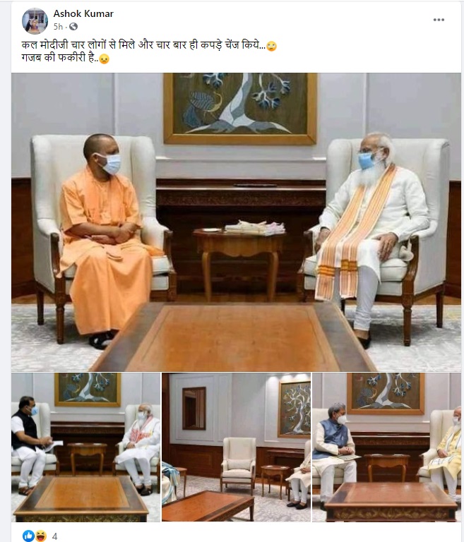 इस मुलाकात के बाद से ही सोशल मीडिया पर पीएम मोदी की कुछ तस्वीरें तेजी से वायरल हो रही हैं। तस्वीर में पीएम मोदी, चार अलग-अलग लोगों के साथ बैठे हुए नजर आ रहे हैं। तस्वीरों को शेयर करते हुए दावा किया जा रहा है कि ये तस्वीरें एक ही दिन की हैं जब पीएम मोदी ने इन लोगों से मुलाकात की थी। साथ ही तंज कसते हुए कहा जा रहा है कि चार लोगों से मिले और चार बार कपड़े बदले।