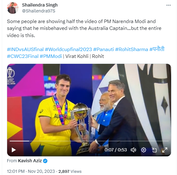 Newschecker ने वायरल दावे की पड़ताल के लिए सबसे पहले संबंधित कीवर्ड की मदद से X पर सर्च किया तो हमें शैलेंद्र सिंह नाम के X हैंडल से 20 नवंबर 2023 को किए गए ट्वीट में क़रीब 53 सेकेंड का वीडियो मिला. इस वीडियो में ऑस्ट्रेलियाई कप्तान को ट्रॉफी थमाए जाने वाले दृश्य मौजूद थे.