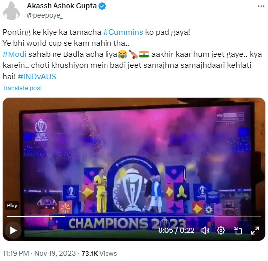 इसके अलावा हमें वर्ल्डकप 2023 का प्रसारण करने वाले हॉटस्टार की वेबसाइट भी फाइनल मैच के हाईलाइट देखने को मिले. इस वीडियो में भी प्रधानमंत्री मोदी को ट्रॉफी थमाने के दौरान पैट कमिंस से मुस्कुराकर हाथ मिलाते और बातें करते हुए देखा जा सकता है.