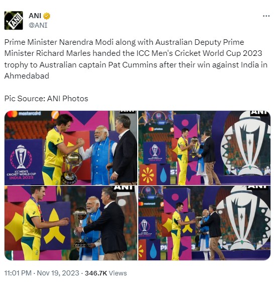 जांच में हमें समाचार एजेंसी एएनआई के आधिकारिक X अकाउंट से भी 19 नवंबर 2023 को शेयर की गई फ़ोटोज मिलीं. इन तस्वीरों में भी पीएम मोदी को ट्रॉफी थमाने के दौरान पैट कमिंस से मुस्कुराकर हाथ मिलाते हुए देखा जा सकता है.