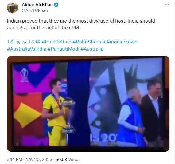 पाकिस्तानी पत्रकार अकबर अली खान ने वायरल वीडियो को अपने वेरिफाईड X अकाउंट से शेयर करते हुए अंग्रेज़ी में लिखा है, जिसका हिंदी अनुवाद है “भारतीयों ने साबित कर दिया कि वे सबसे अपमानजनक मेज़बान हैं. भारत को अपने पीएम के इस कृत्य के लिए माफी मांगनी चाहिए’”.