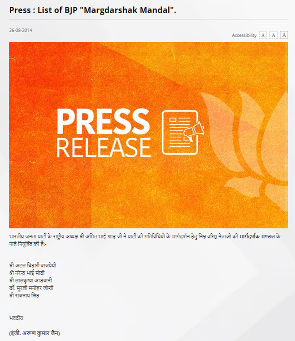 इस प्रेस रिलीज में लिखा हुआ था कि “भारतीय जनता पार्टी के राष्ट्रीय अध्यक्ष श्री अमित भाई शाह जी ने पार्टी की गतिविधियों के मार्गदर्शन हेतु निम्न वरिष्ठ नेताओं की मार्गदर्शक मण्डल के नाते नियुक्ति की है:- श्री अटल बिहारी वाजपेयी, श्री नरेन्द्र भाई मोदी, श्री लालकृष्ण आडवानी, डाॅ. मुरली मनोहर जोशी, श्री राजनाथ सिंह”.