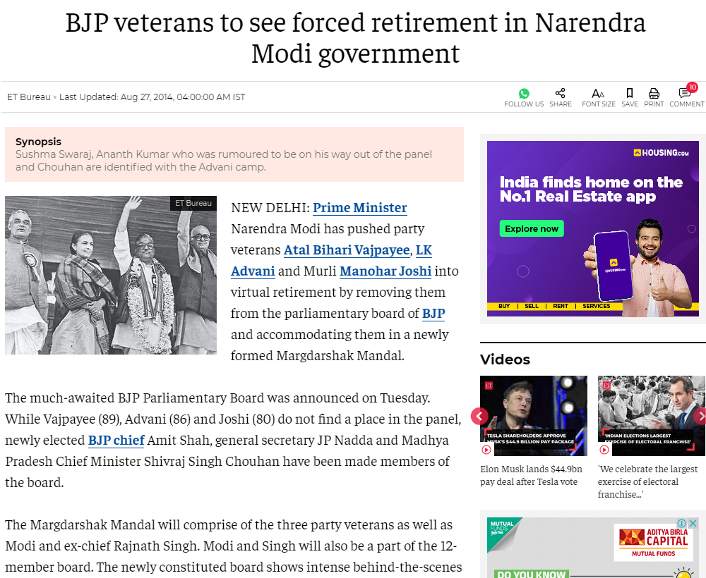 जांच में हमें 27 अगस्त 2014 को द इकोनोमिक टाइम्स की वेबसाइट पर प्रकाशित रिपोर्ट भी मिली. इस रिपोर्ट में बताया गया था कि मंगलवार 26 अगस्त 2014 को भाजपा संसदीय बोर्ड की घोषणा की गई. संसदीय बोर्ड में अटल बिहारी वाजपेयी, लाल कृष्ण आडवाणी और मुरली मनोहर जोशी को जगह नहीं दी गई. इसके बदले तीनों पुराने नेताओं को मार्गदर्शक मंडल में जगह दी गई है. इसके अलावा मार्गदर्शक मंडल में प्रधानमंत्री मोदी और राजनाथ सिंह को भी शामिल किया गया है.