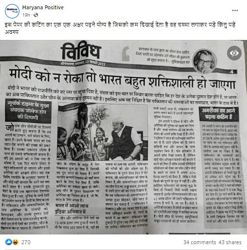 एक अखबार की कटिंग शेयर कर दावा किया गया कि न्यूयॉर्क टाइम्स के मुख्य संपादक जोसेफ होप ने कहा है कि यदि पीएम मोदी को न रोका गया तो भारत बहुत शक्तिशाली हो जायेगा।