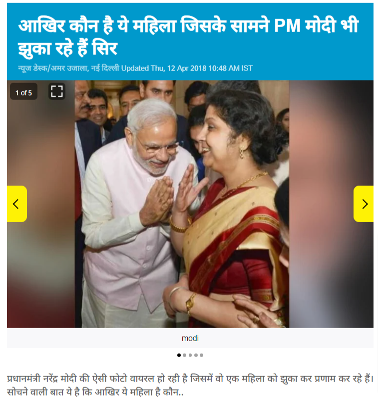 प्रधानमंत्री मोदी द्वारा नीता अंबानी के आगे हाथ जोड़ने के दावे के साथ शेयर की जा रही वायरल तस्वीर की पड़ताल के लिए हमने सबसे पहले तस्वीर को गूगल पर ढूंढा पर इस प्रक्रिया में हमें कोई ख़ास जानकारी प्राप्त नहीं हुई. इसके बाद हमने वायरल तस्वीर को क्रॉप कर सिर्फ उस हिस्से को गूगल पर ढूंढा जिसमें प्रधानमंत्री हाथ जोड़े खड़े दिखते हैं. इस प्रक्रिया में हमें एक वेबसाइट पर प्रधानमंत्री मोदी की हाथ जोड़ने वाली इसी तस्वीर का एक दूसरा वर्जन प्राप्त हुआ जिसमें प्रधानमंत्री मोदी एक महिला के आगे हाथ जोड़ते देखे जा सकते हैं. वेबसाइट पर मौजूद जानकारी के अनुसार प्रधानमंत्री मोदी जिस महिला का हाथ जोड़कर अभिवादन कर रहें हैं वह उद्योगपति गौतम अडानी की पत्नी प्रीति अडानी हैं. बता दें कि हमें उक्त वेबसाइट पर मौजूद कंटेंट अन्नू बौद्ध नामक एक ट्विटर यूजर के टाइमलाइन से मिला है जहां कई ऐसी फ़ेक न्यूज़ मिली जिनका हमने पूर्व में फैक्ट-चेक किया है.