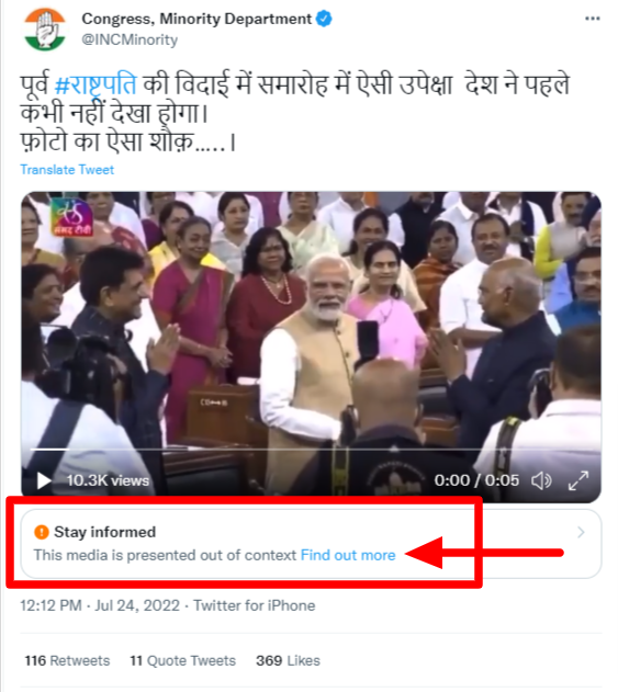 बता दें कि यह वीडियो पूर्व राष्ट्रपति रामनाथ कोविंद के लिए संसद भवन के सेंट्रल हॉल में आयोजित एक विदाई समारोह का है, जिसमें सत्ता पक्ष से लेकर विपक्ष के तमाम बड़े नेता मौजूद रहे थे. संसद टीवी द्वारा यूट्यूब पर अपलोड किए वीडियो में 10 सेकंड के बाद पूर्व राष्ट्रपति को मंच से उतरकर विदाई समारोह में उपस्थित अतिथियों से मुलाकात करते देखा जा सकता है. इसी वीडियो में 57 सेकंड के बाद प्रधानमंत्री नरेंद्र मोदी को निवर्तमान राष्ट्रपति रामनाथ कोविंद का अभिवादन करते देखा जा सकता है. हालांकि, 1 मिनट 1 सेकंड के बाद जब पूर्व राष्ट्रपति प्रधानमंत्री मोदी के सामने खड़े होकर दूसरों का अभिवादन करते हैं, तब प्रधानमंत्री किसी दूसरी तरफ देख रहे होते हैं.