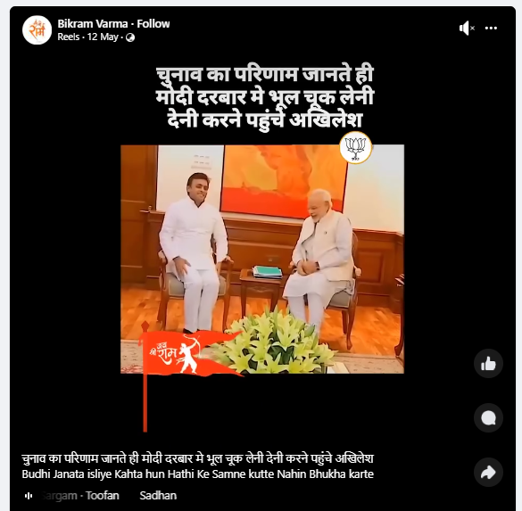 वायरल वीडियो में अखिलेश यादव सबसे पहले प्रधानमंत्री मोदी को गुलदस्ता देते और इसके बाद हाथ मिलाते नजर आ रहे हैं. इस दौरान दोनों बातचीत करते भी नजर आ रहे हैं. वीडियो में सबसे ऊपर एक टेक्स्ट भी मौजूद है, जिसमें लिखा हुआ है “चुनाव का परिणाम जानते ही मोदी दरबार में भूल चुक लेनी देनी करने पहुंचे अखिलेश”.