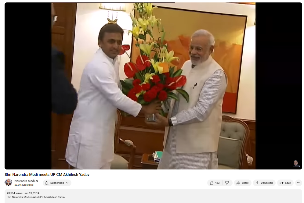 Newschecker ने वीडियो में दिख रहे दृश्यों की मदद से कीवर्ड सर्च किया. इस दौरान हमें नरेंद्र मोदी के आधिकारिक यूट्यूब अकाउंट से 13 जून 2014 को अपलोड किया गया 19 सेकेंड का यह वीडियो मिला. वीडियो के डिस्क्रिप्शन में लिखा हुआ था कि नरेंद्र मोदी ने उत्तर प्रदेश के मुख्यमंत्री अखिलेश यादव से मुलाक़ात की. बतातें चले कि साल 2012 से लेकर 2017 तक अखिलेश यादव उत्तर प्रदेश के मुख्यमंत्री थे.