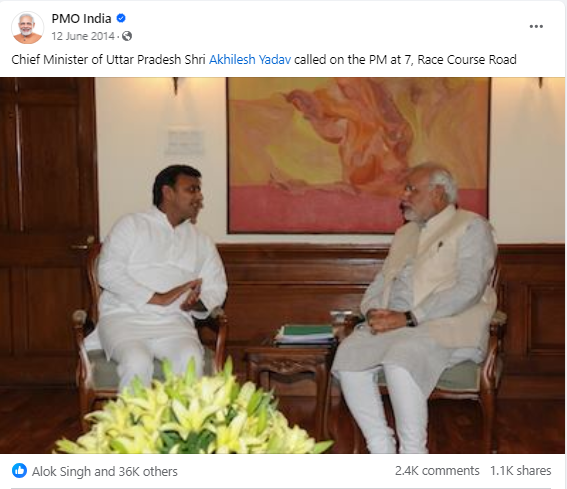 पड़ताल के दौरान हमें प्रधानमंत्री कार्यालय के फेसबुक अकाउंट से भी 12 जून 2014 को इस मुलाकात की एक तस्वीर अपलोड की गई मिली. इस तस्वीर के कैप्शन में भी बताया गया था कि उत्तर प्रदेश के मुख्यमंत्री अखिलेश यादव ने 7 रेस कोर्स रोड स्थित आवास में पीएम नरेंद्र मोदी से मुलाक़ात की.