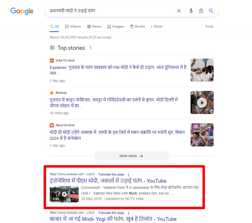 प्रधानमंत्री नरेंद्र मोदी द्वारा मकर संक्रांति के अवसर पर पतंग उड़ाने के नाम पर शेयर किए जा रहे दावे की पड़ताल के लिए हमने ‘प्रधानमंत्री मोदी ने उड़ाई पतंग’ कीवर्ड्स को गूगल पर ढूंढा. इस प्रक्रिया में हमें यह जानकारी मिली कि वायरल वीडियो साल 2018 से ही इंटरनेट पर मौजूद है.