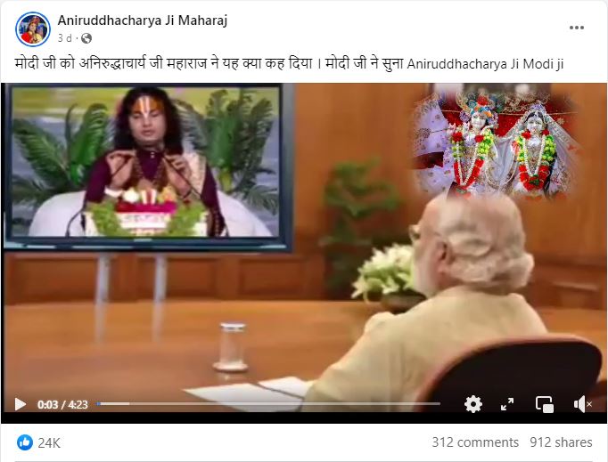 सोशल मीडिया पर एक वीडियो शेयर कर दावा किया जा रहा है कि पीएम नरेंद्र मोदी, कथावाचक अनिरुद्धाचार्य का प्रवचन सुन रहे हैं।