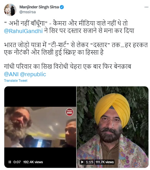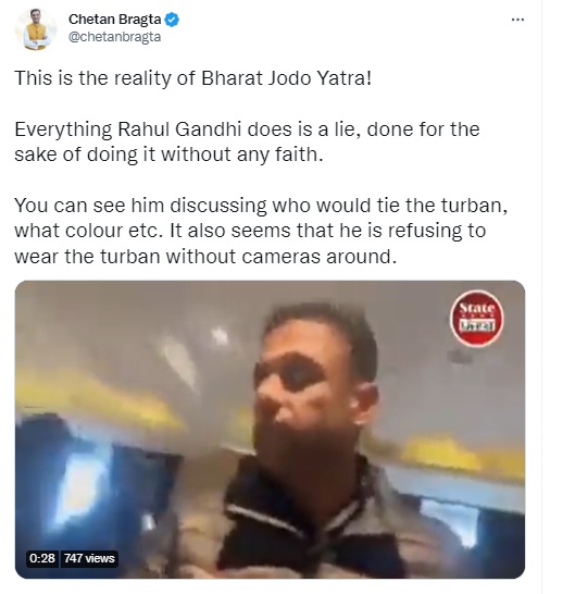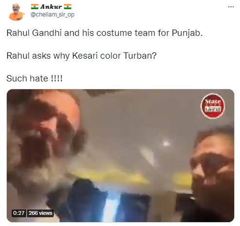 सोशल मीडिया यूजर्स, राहुल गांधी और पगड़ी पहनाने वाले व्यक्ति के बीच संवाद के इस वीडियो को कांग्रेस नेता पर राजनैतिक फायदे के लिए धार्मिक भावनाओं के दुरूपयोग के नाम पर शेयर कर रहे हैं. भाजपा की आईटी सेल के प्रभारी अमित मालवीय समेत कई अन्य भाजपा पदाधिकारियों ने भी वायरल वीडियो को शेयर किया है.
