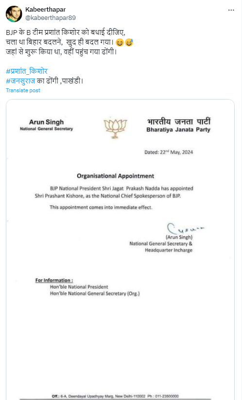 वायरल लेटर कथित तौर पर भाजपा के राष्ट्रीय सचिव अरुण सिंह की तरफ से जारी किया गया है और इसे जारी करने की तारीख 22 मई 2024 लिखी हुई है. इसके अलावा लेटर में लिखा हुआ है कि भाजपा के राष्ट्रीय अध्यक्ष जेपी नड्डा ने श्री प्रशांत किशोर को भाजपा का राष्ट्रीय मुख्य प्रवक्ता नियुक्त किया है.