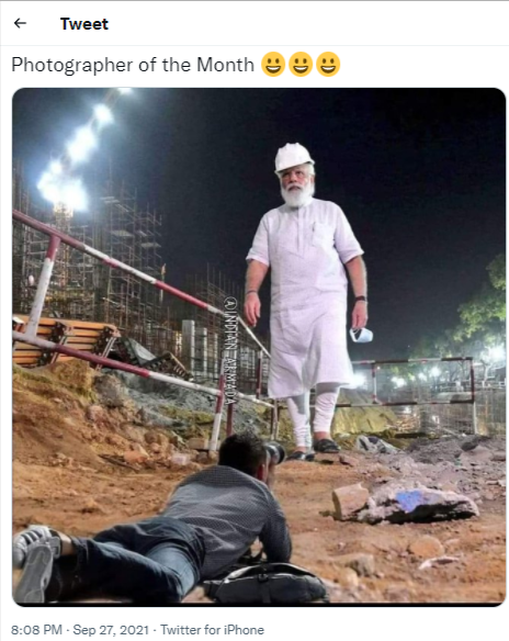 वहीं, दूसरी वायरल तस्वीर की पड़ताल के लिए हमने ट्विटर एडवांस सर्च की सहायता ली। इस दौरान हमें एक ट्वीट प्राप्त हुआ। प्राप्त ट्वीट में प्रधानमंत्री मोदी की तस्वीर को शेयर किया गया है। पोस्ट में जमीन पर लेटकर एक फोटोग्राफर पीएम मोदी की तस्वीर खींचता दिख रहा है।