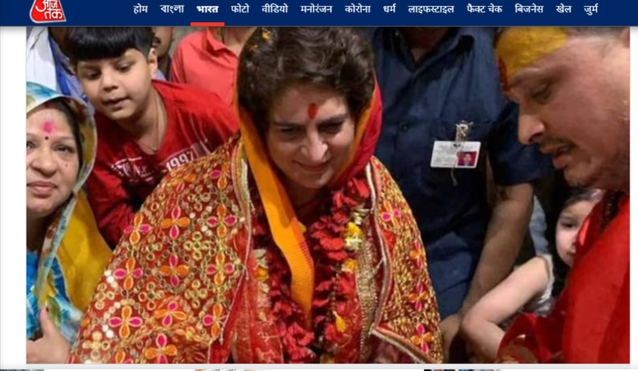 क्या सच में प्रियंका गांधी चुनाव जीतने के लिए, मंदिर-मंदिर माथा टेक रही हैं या फिर प्रिंयका ने दलितों के यहां झाड़ू लगाते हुए यह फोटोशूट कराया? वायरल हो रही पहली तस्वीर का सच जानने के लिए हमने कुछ कीवर्ड्स की सहायता से गूगल पर खोजना शुरू किया। इस दौरान हमें 19 मार्च 2019 को आजतक द्वारा प्रकाशित एक लेख प्राप्त हुआ। लेख के मुताबिक, प्रियंका गांधी उस वक्त उत्तर प्रदेश में 3 दिवसीय दौरे पर थीं। इस बीच उन्होंने मिर्जापुर स्थित विंध्याचल मंदिर में दर्शन किया और मंदिर के विजिटर बुक में जय माता दी भी लिखा। दर्शन के दौरान प्रियंका ने लाल साड़ी पहनी हुई थी। जिसकी फोटो हाल-फिलहाल वायरल हो रही है। आजतक में प्रकाशित पूरी खबर को यहां पढ़ा जा सकता है।