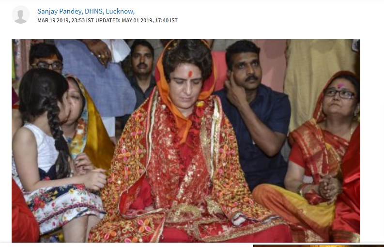 पड़ताल के दौरान ही हमें 19 मई 2019 को Deccanherald में प्रकाशित एक लेख मिला। लेख के साथ प्रियंका गांधी की विंध्याचल मंदिर में दर्शन के दौरान की एक फोटो भी प्रकाशित है, जिसे एडिट कर उपरोक्त दावे के साथ वायरल किया जा रहा है।
