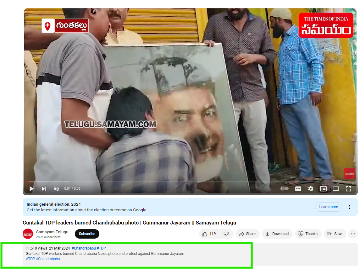 अब हमने गूगल पर “गुंटकल”, “चंद्रबाबू नायडू फोटो” और “आग” जैसे कीवर्ड्स को खोजा. इस दौरान हमें मार्च 2024 को समयम तेलुगु की एक वीडियो रिपोर्ट मिली। इसमें वीडियो का एक छोटा संस्करण दिखाया गया था, और कहा गया था, “गुंटकल टीडीपी कार्यकर्ताओं ने चंद्रबाबू नायडू की तस्वीर जलाई और गुम्मनुर जयराम के खिलाफ विरोध प्रदर्शन किया”।