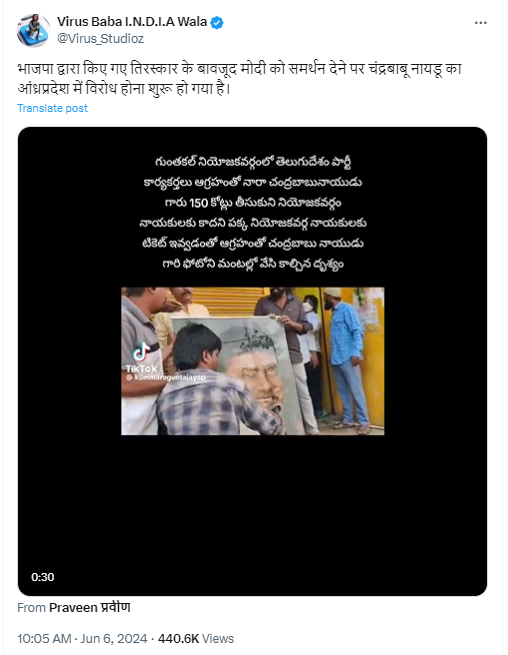 लोकसभा चुनाव के नतीजे घोषित होने के बाद एनडीए ने सर्वसम्मति से नरेंद्र मोदी को अपना नेता चुन लिया है। टीडीपी द्वारा भाजपा को अपना समर्थन देने की पुष्टि करने के बीच एक वीडियो सोशल मीडिया पर वायरल हो रहा है। वीडियो में प्रदर्शनकारी चंद्रबाबू नायडू की तस्वीर पर चप्पल मारते हुए और उसे आग के हवाले करते हुए नज़र आ रहे हैं।