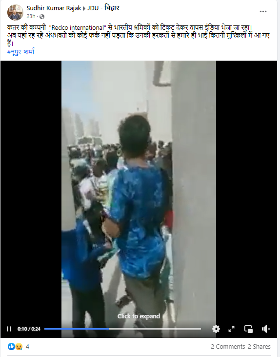 सोशल मीडिया पर एक वीडियो शेयर कर दावा किया जा रहा है कि पैगम्बर मोहम्मद पर पूर्व बीजेपी नेताओं द्वारा की गई विवादित टिप्पणी के बाद, Redco International कंपनी भारतीय कर्मचारियों को टिकट देकर वापस भेज रही है। यह वीडियो अलग-अलग दावे के साथ सोशल मीडिया पर वायरल है।