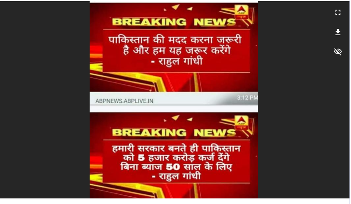 वायरल हो रहे तीन ग्राफिक्स में पहले ग्राफिक में लिखा हुआ है कि “राहुल गांधी ने यह कहा है कि कश्मीर पाकिस्तान को दे देना चाहिए”. वहीं दूसरे ग्राफिक में लिखा हुआ है, “पाकिस्तान की मदद करना जरूरी है और हम यह जरूर करेंगे – राहुल गांधी”. इसके अलावा तीसरे ग्राफिक में लिखा हुआ है, “हमारी सरकार बनते ही पाकिस्तान को 5 हजार करोड़ कर्ज देंगे बिना ब्याज 50 साल के लिए- राहुल गांधी”.