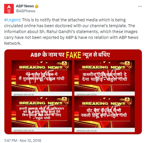 एबीपी न्यूज ने ट्वीट करते हुए लिखा था कि, “यह सूचित किया जाता है कि ऑनलाइन सर्कुलेट किया जा रहा यह ग्राफिक्स हमारे चैनल के टेम्पलेट के साथ छेड़छाड़ कर तैयार किया गया है. राहुल गांधी के बयान, जो इन तस्वीरों में हैं, एबीपी द्वारा रिपोर्ट नहीं किए गए हैं और इनका एबीपी न्यूज नेटवर्क से कोई संबंध नहीं है”.