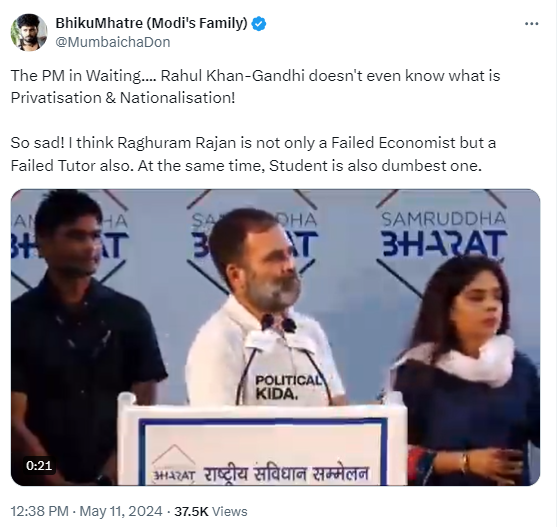 13 मई 2024 को एक्स पर शेयर किये गए इस वीडियो में दर्शकों में से एक व्यक्ति मंच पर खड़े राहुल गाँधी से पूछता है, ”जितनी संस्थाओं का निजीकरण किया गया है, क्या उनका राष्ट्रीयकरण किया जायेगा?” इसके जवाब में राहुल गाँधी मंच पर खड़ी महिला से पूछते हैं, ”राष्ट्रीय.. क्या?” जवाब में महिला कहती हैं, ”निजीकरण को वापस करा जाएगा?” सवाल पूछ रहा व्यक्ति भी दोहराता है, ”जितनी संस्थाओं को मोदी जी ने बेच दिया है, क्या उन संस्थानों का फिर से राष्ट्रीयकरण होगा?” राहुल गाँधी जवाब में कहते हैं ”ये तो मुश्किल होगा ..”