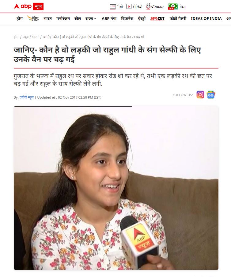 पड़ताल के दौरान एबीपी न्यूज द्वारा नवंबर 2017 में प्रकाशित एक रिपोर्ट मिली। रिपोर्ट के अनुसार, राहुल गांधी के साथ सेल्फी लेने वाली लड़की का नाम मंतशा इब्राहिम सेठ है। मंतशा राहुल गांधी से बहुत समय से मिलना चाहती थी। उस वक्त 10वीं क्लास में पढ़ने वाली मतंंशा ने स्कूल से एक दिन की छुट्टी भी ली थी। उन्होंने एबीपी न्यूज को बताया, “मैं भरूच स्टेशन से ही रैली में शामिल हो गई थी और जैसे ही राहुल गांधी को लगा कि मैं कुछ कहना चाहती हूं, तो उन्होंने मुझे अपनी तरफ बुलाया। उन्होंने मुझे एक गुलदस्ता दिया। इसके बाद उन्होंने मेरी सेल्फी की रिक्वेस्ट भी मान ली। राहुल के साथ सेल्फी लेना सपना सच होने जैसा है।”