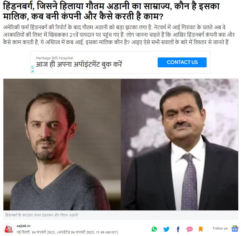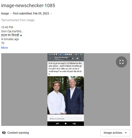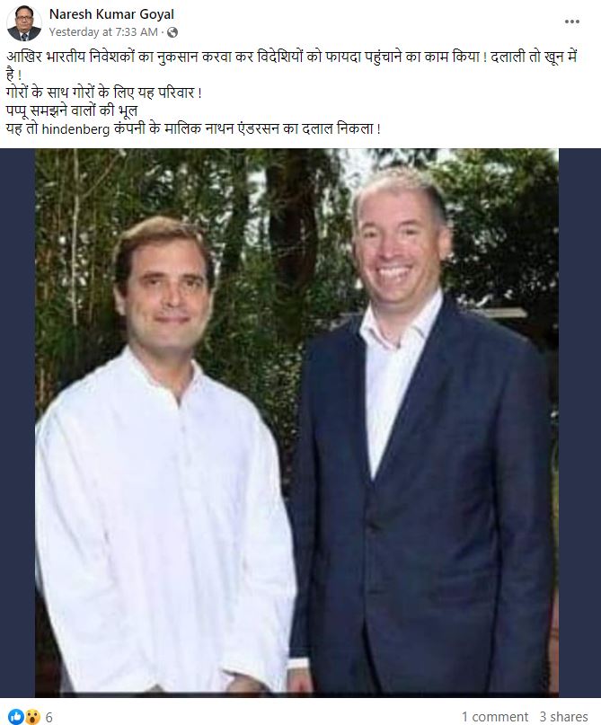 दरअसल, अमेरिका की फॉरेंसिक फ़ाइनेंशियल कंपनी ‘हिंडनबर्ग’ ने बीते 24 जनवरी को अपनी एक रिपोर्ट प्रकाशित की, जिसमें उसने भारत के उद्योगपति गौतम अडानी पर गंभीर आरोप लगाए। रिपोर्ट के बाद अडानी समूह की कंपनियों के शेयर में भारी गिरावट दर्ज की गई। यह रिपोर्ट सामने आने के बाद विपक्ष ने सरकार से अडानी समूह पर लगे आरोपों की जांच कराने की मांग की है। इसके बाद कांग्रेस सांसद राहुल गांधी की एक तस्वीर शेयर कर दावा किया जा रहा है कि उनके साथ हिंडनबर्ग के संस्थापक नाथन एंडरसन मौजूद हैं।