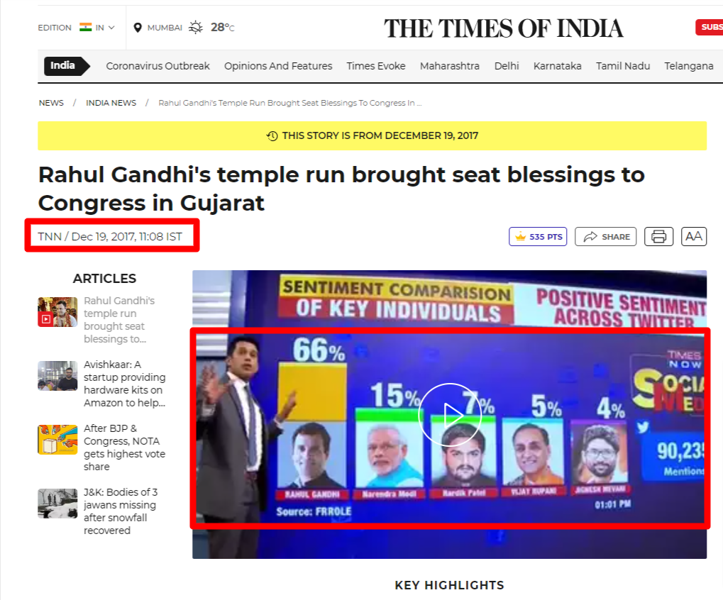 Newschecker द्वारा वायरल तस्वीर की असल तस्वीर से मिलान पर करने पर हमने पाया कि Times Now ने इस ग्राफ़िक में गुजरात और हिमाचल प्रदेश विधानसभा चुनावों को लेकर ट्विटर पर राहुल गांधी की लोकप्रियता बढ़ने की जानकारी दी थी. वायरल तस्वीर में हार्दिक पटेल की जगह ममता बनर्जी, विजय रुपानी की जगह अखिलेश यादव और जिग्नेश मेवानी की जगह अरविंद केजरीवाल की तस्वीर लगाई गई है, लेकिन पहले से मौजूद नामों तथा आंकड़ों में कोई परिवर्तन नहीं किया गया है.
