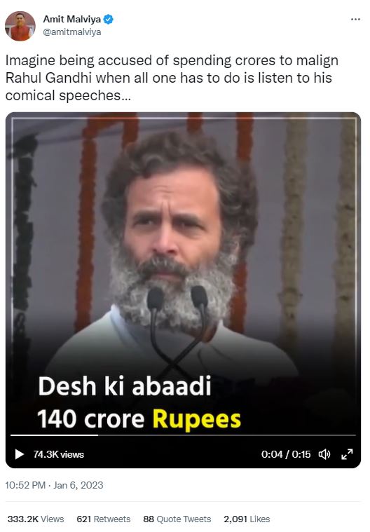 सोशल मीडिया पर कांग्रेस सांसद राहुल गांधी के एक वीडियो को शेयर कर दावा किया जा रहा है कि उन्होंने देश की आबादी को 140 करोड़ रुपये बताया है।