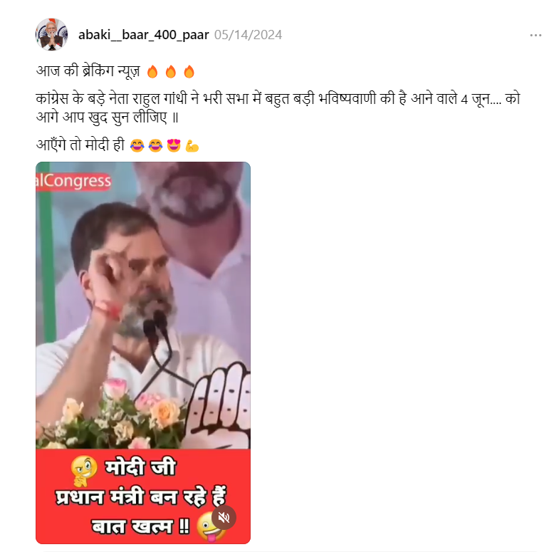 वायरल क्लिप में एडिट करके राहुल गाँधी के बयान को बदल दिया गया है। ”2024, 4 जून, नरेंद्र मोदी हिन्दुस्तान के प्रधानमन्त्री नहीं रहेंगे!” से ‘नहीं’ शब्द काट दिया गया है, और ”अब आप देखना उत्तर प्रदेश में हमारे गठबंधन को 50 से कम एक सीट नहीं मिलने वाली है” में से ’50 से कम’ काट दिया गया है।