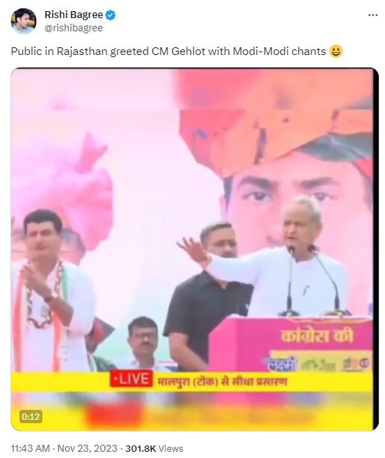 वीडियो को ऋषि बागरी नाम के वेरिफ़ाईड X हैंडल से अंग्रेज़ी कैप्शन के साथ शेयर किया गया है, जिसका हिंदी अनुवाद है, ‘राजस्थान के लोगों ने सीएम गहलोत का स्वागत मोदी-मोदी के नारों से किया”.