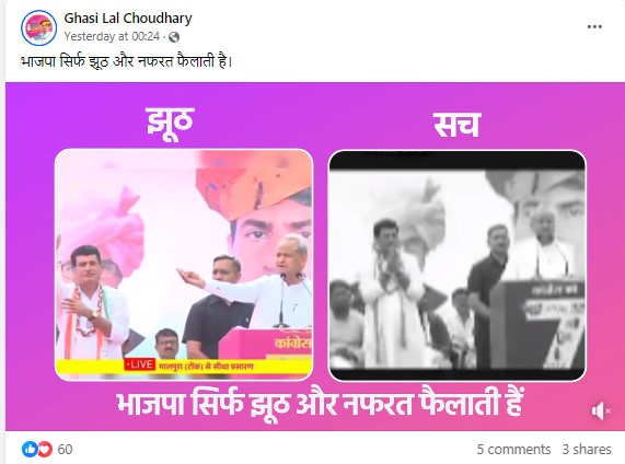 जांच में हमें मालपुरा से कांग्रेस प्रत्याशी घासी लाल चौधरी के फ़ेसबुक अकाउंट से भी 23 नवंबर 2023 को शेयर किया गया एक पोस्ट मिला. इस फ़ेसबुक पोस्ट में उन्होंने वायरल वीडियो को झूठा बताते हुए असल वीडियो शेयर किया है, जिसमें मोदी-मोदी वाले नारे मौजूद नहीं हैं.