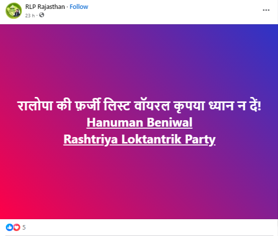 कुछ स्थानीय यूजर्स तथा पोर्टल्स का दावा है कि कि पार्टी 20 अक्टूबर, 2023 को अपने प्रत्याशियों की सूची जारी कर सकती है. वायरल दावे के बारे में अधिक जानकारी के लिए हमने पार्टी अध्यक्ष हनुमान बेनीवाल से संपर्क करने का प्रयास किया, लेकिन अभी तक उनका जवाब नहीं मिल सका है. उनका जवाब आने पर उसे लेख में शामिल किया जाएगा.