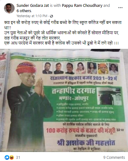 सोशल मीडिया पर एक तस्वीर शेयर कर दावा किया गया है कि राजस्थान की गहलोत सरकार ने दरगाहों के विकास लिए 100 करोड़ रुपये का बजट आवंटित किया है।